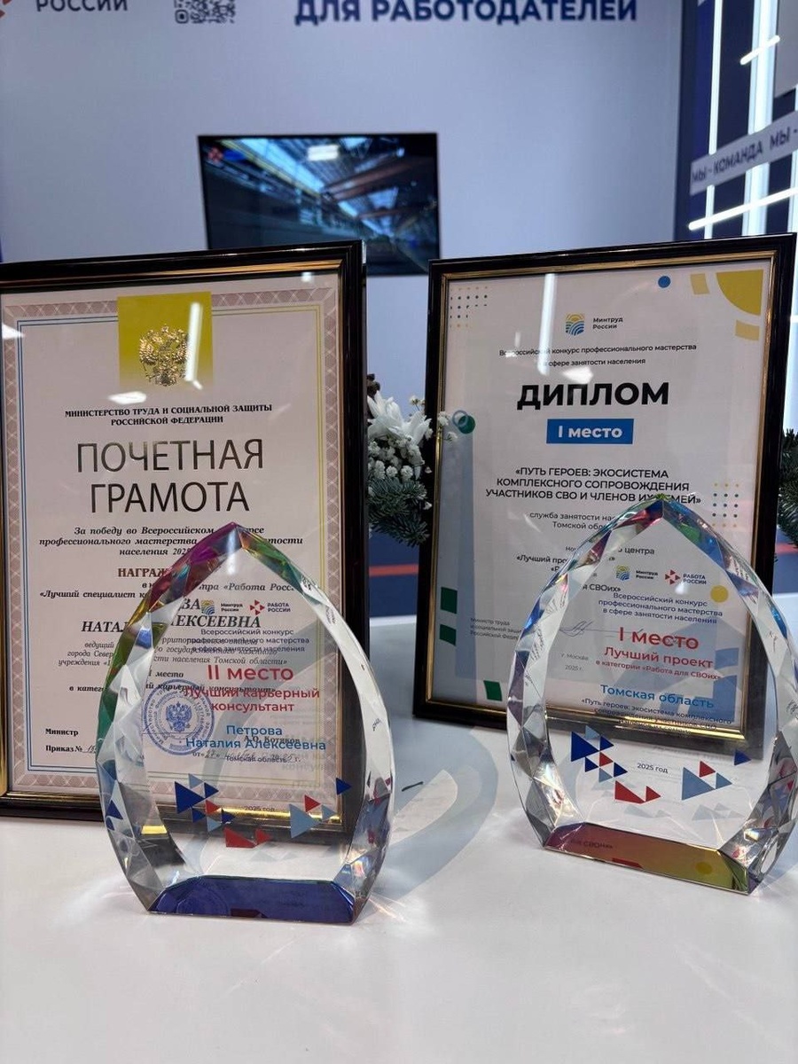 Томская область завоевала награды всероссийского конкурса в сфере занятости Вчера на церемонии в Москве наградили победителей и призёров всероссийского конкурса профессионального мастерства в сфере занятости. Томская область завоевала сразу две награды. Первое место на федеральном уровне получил томский проект «Путь Героев» по комплексному сопровождению участников СВО и их семей. Серебро в номинации «Лучший карьерный консультант» взяла Наталия Петрова — ведущий инспектор кадрового центра «Работа России» в ЗАТО Северск. Это первое призовое место такого высокого уровня для специалиста службы занятости региона.