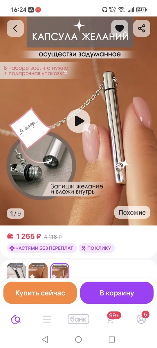 Особенно, когда времени выбрать что-то другое уже нет или же лень вообще что-либо искать. Да, такое тоже бывает. Поэтому какая-то добрая душа продают на ВБ такой замечательный подарочный набор. Здесь уже есть всё необходимое - красивый кулон на цепочке (хотя и вызывающий лично у меня довольно странные ассоциации), бумага для записи желаний и инструкция. И всё это в красивой подарочной упаковке. Готовый стильный подарок и голову ломать не надо. Есть, конечно, и просто кулоны-капсулы, чуть менее изящные в три раза дешевле. Куда, собственно, тоже вполне себе можно поместить бумажку с желанием, но эффект будет уже не тот. А что касается ассоциаций - ведь не мне же одной этот кулон напоминает контейнер для запрещённых веществ или капсулу для праха? Или о такой практике кроме меня никто не знает? По крайней мере с домашним животными (очень надеюсь, что только с животными) такое практикуется. Хотя, кому захочется постоянно носить с собой прах своего питомца? Как-то это нездорово, да и посто