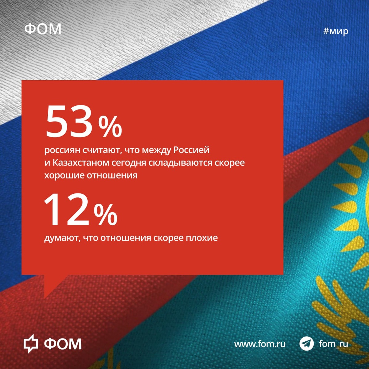 🇷🇺🇰🇿 Россия и Казахстан: Представления россиян о Казахстане и отношениях между странами На прошлой неделе в Москве прошла встреча президентов России и Казахстана – Владимира Путина и Касым-Жомарта Токаева. Об этом событии знали или слышали о нём 47% респондентов, 51% – не слышали. Основными результатами встречи люди назвали укрепление сотрудничества между странами, сближение и улучшение отношений, а также заключение договоров. Подробнее: fom.ru #внешняяполитика #страныСНГ #Казахстан 📱 Фонд Общественное Мнение