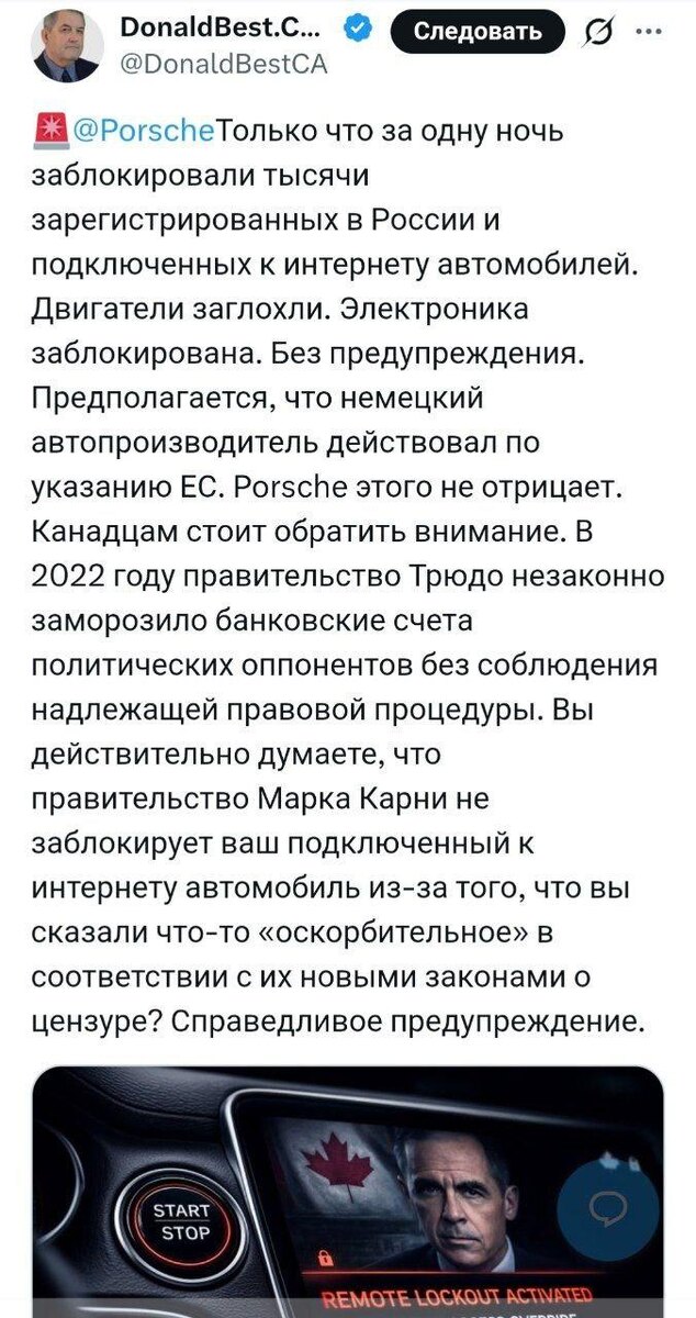 Попытка Porsche заблокировать автомобили в России получила отклик в Канаде Канадский активисты теперь не советуют покупать машину, которую могут заблокировать по решению правительства другой страны --- Владельцы автомобилей Porsche в России столкнулись с «окирпичиванием» автомобилей через ложную блокировку штатной охранной системы через спутник начиная с этих выходных Под блокировку попадают самые разные автомобили немецкой марки В «Рольфе» отметили рост количества обращений в сервисы, и заявили, что это могло быть сделано умышленно Блокировка снимается путём перезагрузки блока охранной системы с его разбором в условиях автосервиса --- Системный сбой, который накануне обездвижил сотни автомобилей Porsche в России, грозит автомобилям всех брендов немецкой группы Volkswagen Владельцы переставших заводиться немецких машин вынуждены обращаться к хакерам для удаления VIN-номеров из базы немецкого автопроизводителя Telegram | Дзен | MAX