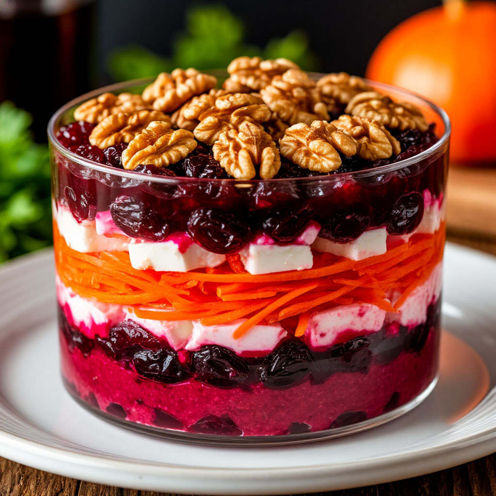 Невероятно вкусный и красивый слоёный салат со свёклой, орехами и черносливом!