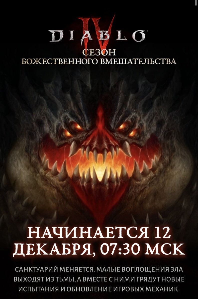 Diablo IV: Сезон «Божественного вмешательства» — всё, что нужно знать Приготовьтесь к новому этапу в мире Санктуария! В Diablo IV начинается сезон «Божественного вмешательства», старт которого запланирован на 12 декабря в 07:30 по московскому времени. Этот сезон принесёт масштабные изменения в игровой мир, новые испытания, переработанные механики и, конечно же, могущественных противников. Сюжет: Вторжение из Преисподней Равновесие Санктуария нарушено. Из мрачных глубин Преисподней явился сам Азмодан, и он не один. Он заключил мрачный союз с другими малыми воплощениями зла — Белиалом, Андариэль и Дюриэлем. Их цель — нести в мир порчу, обман и тьму, чтобы подчинить себе земли людей. Но надежда ещё жива. Ангел возмездия Гадриэль готов встать на защиту человечества. Заключив с ним союз, игроки получат доступ к божественным дарам, которые помогут сдержать натиск сил тьмы. Ключевые нововведения сезона 1. Охота на Владык Преисподней Игрокам предстоит выслеживать и сражаться с малыми в