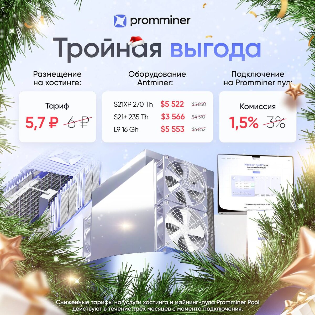 ⚡️ Новогоднее спецпредложение На оборудование, размещение на хостинге и подключение к Promminer Pool: 🔵 Antminer S21 XP на 270 TH/s — $5 522 $5 850 🔵 Antminer S21+ на 235 TH/s — $3 566 $4 310 🔵 Antminer L9 на 16 GH/s — $5 553 $6 832 🔵 Тариф размещения на хостинге — 5,7 вместо 6 руб/кВт·ч 🔵 Комиссия майнинг-пула — 1,5% вместо 3% Цены указаны с учетом НДС 20%. 🔥 При оформлении заказа сейчас оборудование будет поставлено до конца текущего года, что позволяет получить дополнительную выгоду. С 1 января 2026 года ставка НДС повысится с 20% до 22%. 💎 Новогоднее спецпредложение действует только до 21.12 включительно. Сниженные тарифы на услуги хостинга и майнинг-пула Promminer Pool действуют в течение трех месяцев с момента подключения. Для уточнения подробностей пишите нашим менеджерам, оставляйте заявку на сайте или звоните по телефону: 8 (800) 350-72-85. 🤍 Promminer: Сайт | ВК | YouTube | Дзен