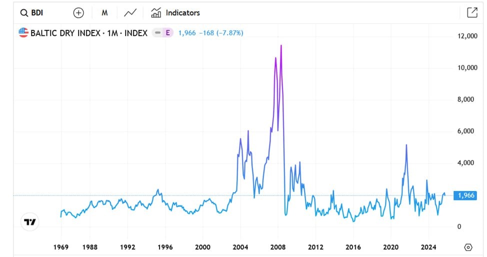 #Commodity #Copper #1W #XCU Медь, как индикатор экономической активности в мире. Часть 1 - индекс Baltic Dry При оценке стоимости меди стоит обращать внимание на индекс Baltic Dry (индекс Балтийской биржи сухих насыпных грузов, отслеживает ставки на сухогрузные суда). Долгосрочно, индекс Baltic Dry торгуется на своих «средних» уровнях. Мы видели всплеск в начале нулевых до глобального финансового кризиса 2008-2009 на фоне стремительного роста мировой экономики, особенно ростом промышленного производства в Китае (его еще прозвали «мировой фабрикой»). В России тоже стремительно развивалась стройка, инфраструктура и тд. Рост экономической активности привел к резкому увеличению спроса на морские перевозки => выросла стоимость транспортировки => выросли ставки фрахта. После глобального фин кризиса мир испытал множество событий, приведших к снижению экономической активности и возврату Baltic Dry на прежние уровни. Сейчас мы наблюдаем обратный процесс - деглобализация, снижение объемо