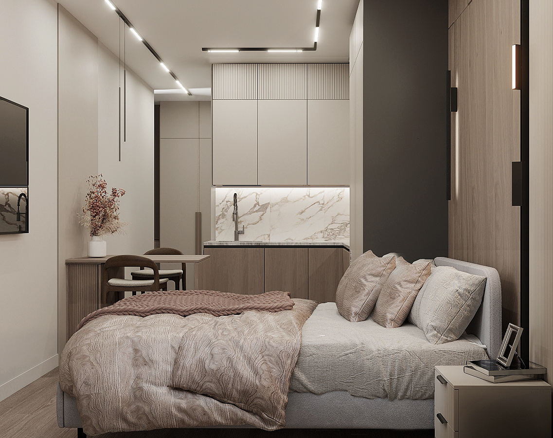 Сегодня хотим углубиться в тему, которая требует не только эстетического видения, но и глубокого понимания рынка – создание дизайн-проекта студии для сдачи в аренду в премиальных жилых комплексах. Наша студия MyDesign подходит к таким задачам как к комплексному проектированию, где каждая деталь должна работать на привлечение качественного арендатора, скорость сдачи объекта и его долгосрочную привлекательность. Ключевые аспекты проработанного интерьера студии для аренды: 1. Спальная зона – фокус на комфорт: Для нас это не просто "спальное место", а зона отдыха, которая должна быть максимально уютной и приватной. Мы отдаем предпочтение комфортной кровати как центральному элементу, создающему ощущение приватности и заботы. 2. Цветовая палитра – основа универсальности: В премиальном сегменте мы часто работаем со светлыми, нейтральными оттенками. Они создают ощущение простора, света, легкости и универсальности, позволяя будущему арендатору легко интегрировать свое личное пространство