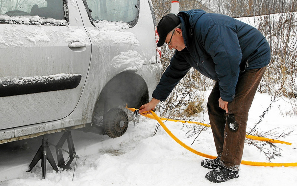 - Поливать колеса кипятком. Это самый популярный и самый вредный «дедовский» метод. От резкого перепада температур тормозной диск или барабан может просто лопнуть. Плюс ко всему, эта вода через пару минут снова замерзнет, и станет только хуже.