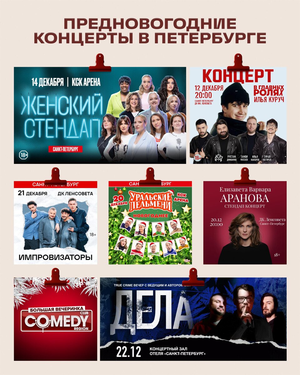 Предновогодние концерты в Петербурге 🧤🫶 Это будут наши финальные встречи в этом году, давайте проведем их ярко 🥰 ДК им. Ленсовета 🌲 12 декабря 20:00 — В главных ролях Гость: Илья Куруч ❄ 20 декабря 20:00 — Елизавета Варвара Аранова 🎄 21 декабря 15:00 и 19:00 — Импровизаторы КСК Арена ✨ 14 декабря 19:00 — Женский стендап Состав: Ирина Мягкова, Мария Маркова, Варвара Щербакова, Ольга Малащенко,Надя Джабраилова, Саша Муратова, Маргарита Родина, Елизавета Варвара Аранова, Карина Мейханаджян, Белла Малу, Виктория Македонская * состав артистов может быть изменен ❄ 20 декабря 19:00 — Уральские пельмени Состав: Дмитрий Брекоткин, Дмитрий Соколов, Сергей Ершов, Сергей Исаев, Максим Ярица, Сергей Калугин, Данила Пятков, Ксения Корнева и Илана. КЗ «Санкт-Петербург» 🌲 22 декабря 17:00 и 20:00 — True crime вечер «Дела» Гость: Дмитрий Позов Buddha- Bar 🎄30 декабря 20:00 — Новогодние вечеринки Comedy Club 💡 Обратите внимание, что на всех мероприятиях действует возрастное ограничение 18+