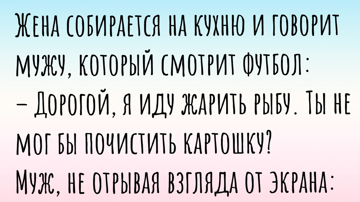 Справедливость восторжествовала! Это классический пример того, как на каждую хитрую лень найдется своя хитрая ответная реакция. Муж попытался использовать технику "бесконтактного участия" в быту, надеясь, что его словесная эквилибристика спасет его от ножа и картофелечистки. Но жена оказалась не промах и применила то же оружие против него. Это учит нас важному уроку: если вы ленитесь в отношениях, будьте готовы получить "ленивый" результат. Нельзя вкладывать в общий котел фантики и надеяться получить золото. Хотя, зная настоящих лентяев, муж, скорее всего, съест рыбу без гарнира и даже не расстроится, ведь жевать картошку — это тоже дополнительные усилия челюстями.