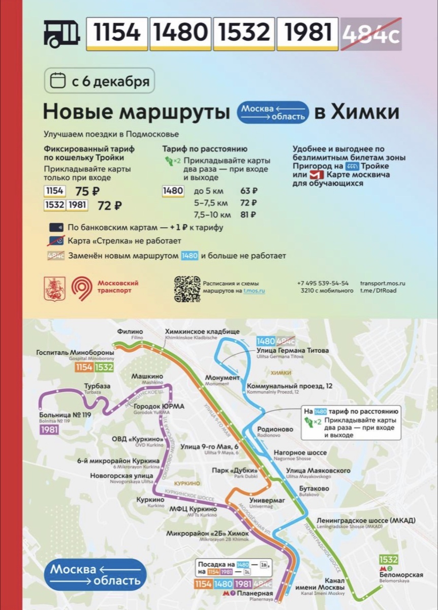 С 6 декабря в Химках появятся новые маршруты до ближайших станций метро и обратно. На линии выйдут современные российские автобусы различной вместимости. Автобусы будут отличаться обозначением «Москва — область» на борту и будут работать по отдельным тарифам. У маршрутов №1154, №1532 и №1981 тариф фиксированный. Прикладывать карту нужно только на вход. Проезд по карте «Тройка» у маршрута №№1154 будет стоить 75 рублей, у маршрутов №№1532 и №1981 — 72 рубля. Проезд по банковской карте обойдётся на рубль дороже. У маршрута №1480 тариф зависит от расстояния. Прикладывать карту нужно два раза: на вход и выход. Проезд по карте «Тройка» будет стоить от 63 до 81 рубля, по банковской карте — от 64 до 82 рублей. На всех четырёх маршрутах действуют безлимитные абонементы «Единый» зоны «Пригород» сроком действия на 30, 90 или 365 дней. Для учащихся доступны абонементы на 30 и 90 дней по карте москвича. Получить скидку при пересадке на метро и другие маршруты не получится. Льготные категории