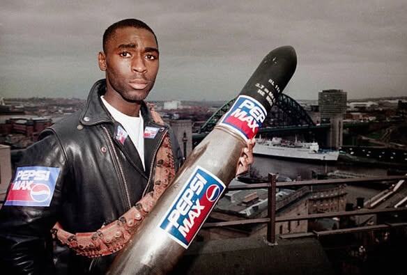 Max ловит даже в Ньюкасле Вот это маркетинг был в 90-х! На фотографиях Энди Коул держит ракету с брендингом Pepsi Max и АК-47 с видом на Ньюкасл, потому что...ну а почему бы и нет) Энди отыграл за местную команду один полноценный сезон и две половинки, забив 68 голов в 85 матчах, прежде чем уйти в Манчестер Юнайтед и продолжить расстреливать вратарей уже там (121 гол в 275 матчах). При этом, в сборную в те года его почти не вызывали - всего две игры в 90-х у него набралось, если не считать 99-й год. А всего у него там вышло 15 матчей - для такого форварда крайне неожиданные цифры. ⚽️ Подписывайтесь на нас в MAX