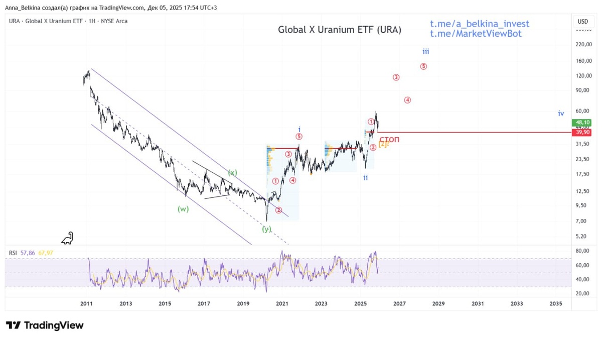 #URA Уран 🕯 Фундаментальный спрос на уран будет продолжать расти, поддерживая рост урана и связанных с урановой деятельностью компаний: - Азия (Китай, Индия) - активно строят новые АЭС, увеличивая потребление урана. - Западные страны и США - пересматривают политику в сторону поддержки ядерной энергетики для снижения углеродных выбросов; стремятся к бОльшей энергетической независимости, развивая собственное обогащение. - Развитие ИИ и нейросетей требует больше энергии, что стимулирует интерес к АЭС. - Напряженная геополитика – потенциальные санкции против поставок ядерного топлива из России + нестабильность в регионах добычи (Нигер) - серьезное недофинансирование отрасли, небольшое предложение. - высокий спрос на спотовый уран со стороны инвест урановых фондов -> создание дефицита. Подсвечивала инвест идею в данном сегменте, как отличный диверсификатор акциям в портфелях (у кого есть возможность выхода на зарубежные рынки). Не является ИИР 💪 БОЛЬШЕ разметок в Закрытом