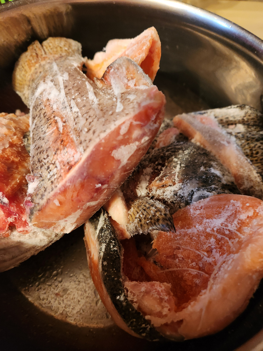 Добрый день, мои дорогие читатели. Несколько дней назад я рассказывала как мы солим форель. Ну а так как рыбу мы всегда стараемся брать целую, то сегодня варю бульон из головы, хвоста и хребта. Все запчасти промываем, жабры удаляем. Складываем суповой набор в кастрюлю и заливаем водой. Правило тоже, что и с холодцом: воды на два сантиметра выше рыбы. Доводим до кипения, тщательно снимаем пену, огонь убираем до минимума. Добавляю большую луковицу, стебли укропа и петрушки, соль, перец чёрный и душистый. Варим около часа-полутора на очень медленно огне. Остужаем рыбу в бульоне. Бульон процеживаем, от рыбных запчастей тщательно отделяем мякоть. На таком бульоне можно варить много разных вариантов супов. Начиная от рыбной солянки и щей, до финского рыбного супа. Можно просто оставить мякоть и заливать её бульоном. Я обычно добавляю картошку, морковь, лук и очищенные от кожи помидоры. А ем, добавляя немного сливок. Спасибо, что читаете. Спокойной вам и сытной зимы, скоро