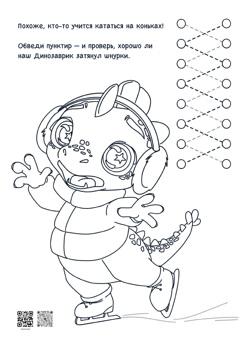 Зима началась, а значит пора доставать коньки — даже если ты динозаврик, который стоит на них впервые ❄️ Наш герой почти поймал равновесие. Обведи пунктир и проверь, хорошо ли он завязал шнурки. Иногда это спасает от падений. 🖨+✏️ Распечатай, раскрась и поделись в комментариях своего динозаврика. ⛸💙 --- (скачать файл можно в https://t.me/paint_moon/47 )
