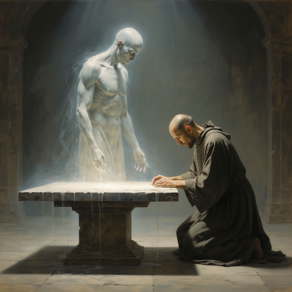 Брат Людвиг стоял спиной к нему у огромного каменного чана. В тусклом свете масляной лампы его фигура отбрасывала на сырую стену гигантскую, изломанную тень. На длинном столе перед ним лежало нечто, накрытое влажным холстом. Рядом сверкали хирургически чистые ножи, скребки, иглы.