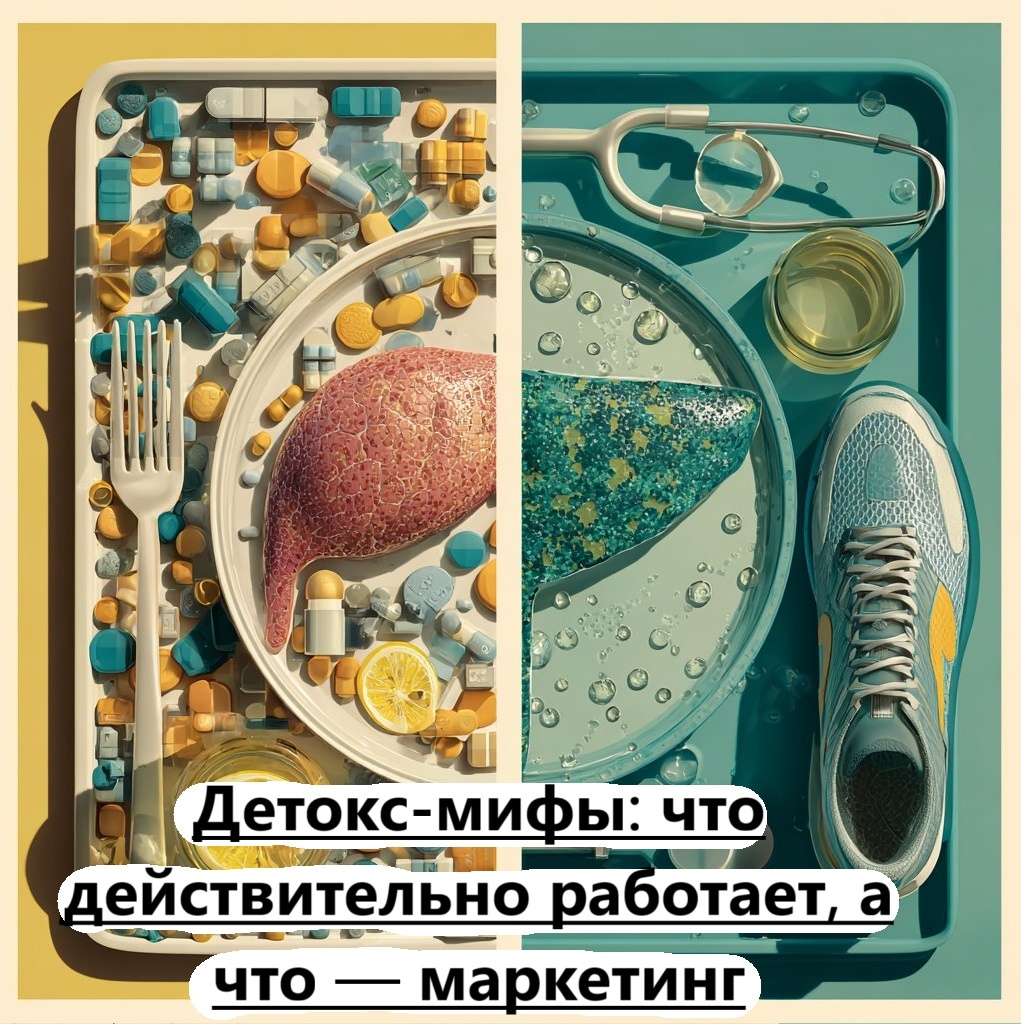 Тема «детокса» популярна: обещания лёгкого очищения, похудения и прилива сил звучат заманчиво. Но что из этого — наука, а что — маркетинг? Давайте разберемся вместе и посмотрим на "детокс" с экспертной точки зрения. Как действительно работает печень 🧠➡️🍃 Печень — главный орган «детокса». Она превращает вредные вещества в более безопасные соединения и помогает их выводить через желчь и мочу. Печень не нуждается в специальных «чистках»: ей нужна поддержка — адекватное питание, отсутствие токсичных нагрузок (алкоголь, лишние лекарства, промышленные токсины) и время для восстановления. Хроническая болезнь печени требует медицинской диагностики и лечения, а не «детокс‑программ». Вода и «очищение» — правда и миф 💧 Правда: достаточная гидратация важна для работы почек — они выводят водорастворимые вещества. Миф: сверхувеличенное потребление воды «вымывает токсины» за считанные часы. Чрезмерное питьё может нарушить электролитный баланс. Правило: пить когда хочется, следить за цветом мочи (
