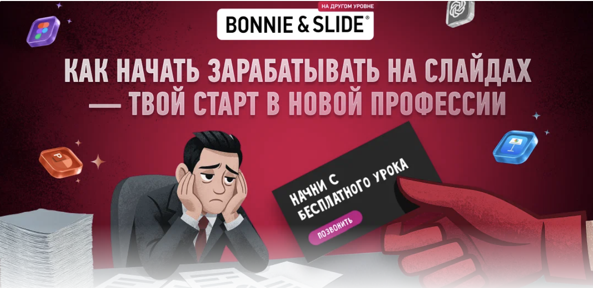 Ты тратишь часы на презентации, но они не приносят результата? Зрители не дослушивают до конца, клиенты не соглашаются на встречу, а твои слайды выглядят “просто нормально”? Bonnie&Slide создали курс, который поможет превратить визуал в инструмент продаж, а не просто фон для текста. 🧩 Почему этот курс — не просто про дизайн Современный бизнес держится не на длинных речах, а на картинках, которые продают идею за 10 секунд. Bonnie&Slide создали программу, где каждый научится превращать сложную мысль в визуальный “крючок”, который цепляет, объясняет и убеждает. ✅ Поймёшь, как работает визуальный сторителлинг — и как донести смысл даже без слов. ✅ Научишься собирать композицию, которая продаёт: структура, ритм, цвета. ✅ Освоишь приёмы, которые дизайнеры используют в дорогих агентствах. ✅ Создашь собственный набор шаблонов для презентаций, постов и коммерческих предложений. Что тебя ждёт на курсе Формат — практический интенсив. За 3 недели ты проходишь путь от “обычного пользователя P