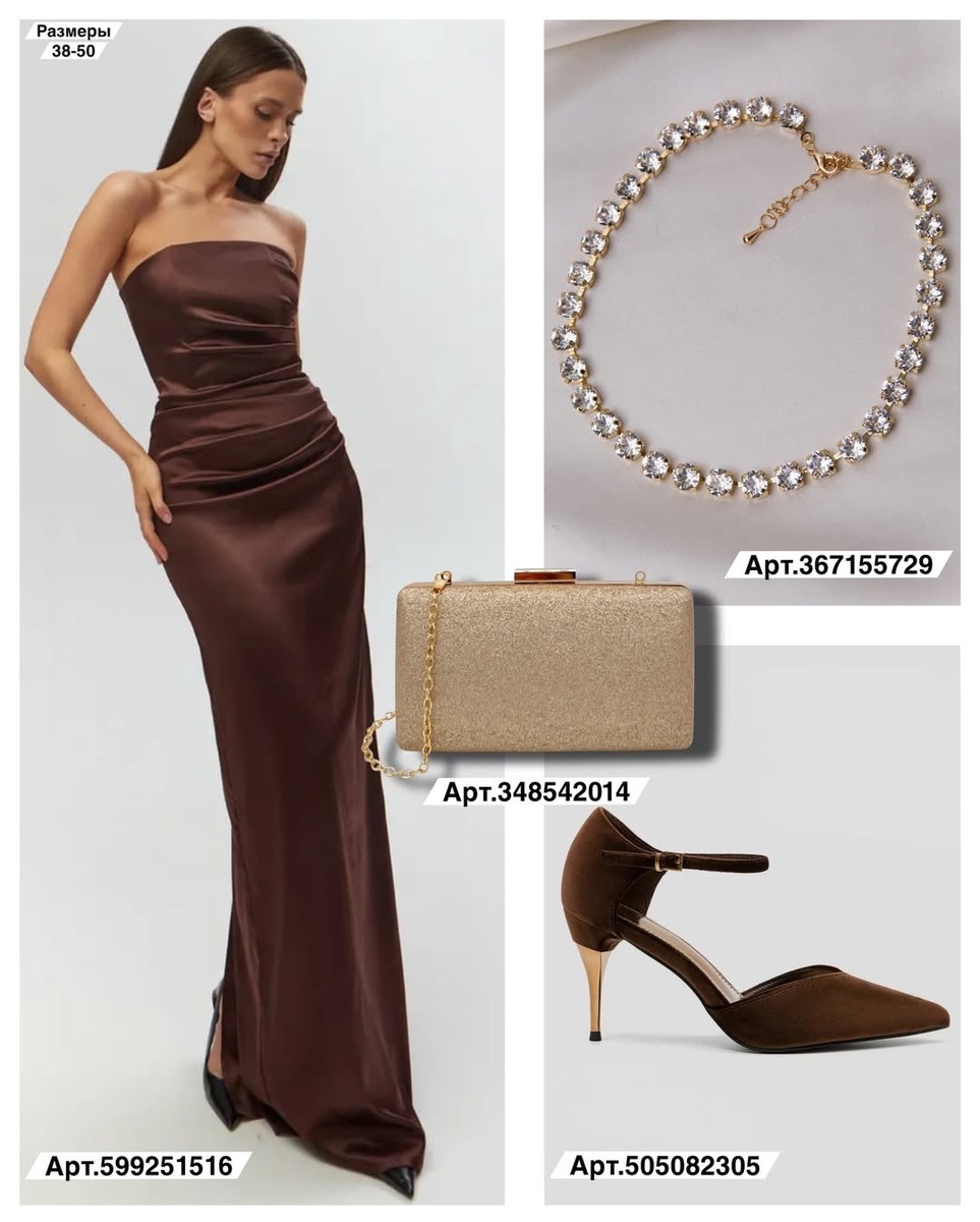В сегодняшней подборке — три элегантных новогодних ансамбля из разных цветовых направлений: шоколадная роскошь, чёрная доминанта и светлая жемчужная классика. Все вещи собраны по артикулам, что позволяет легко находить каждую позицию.