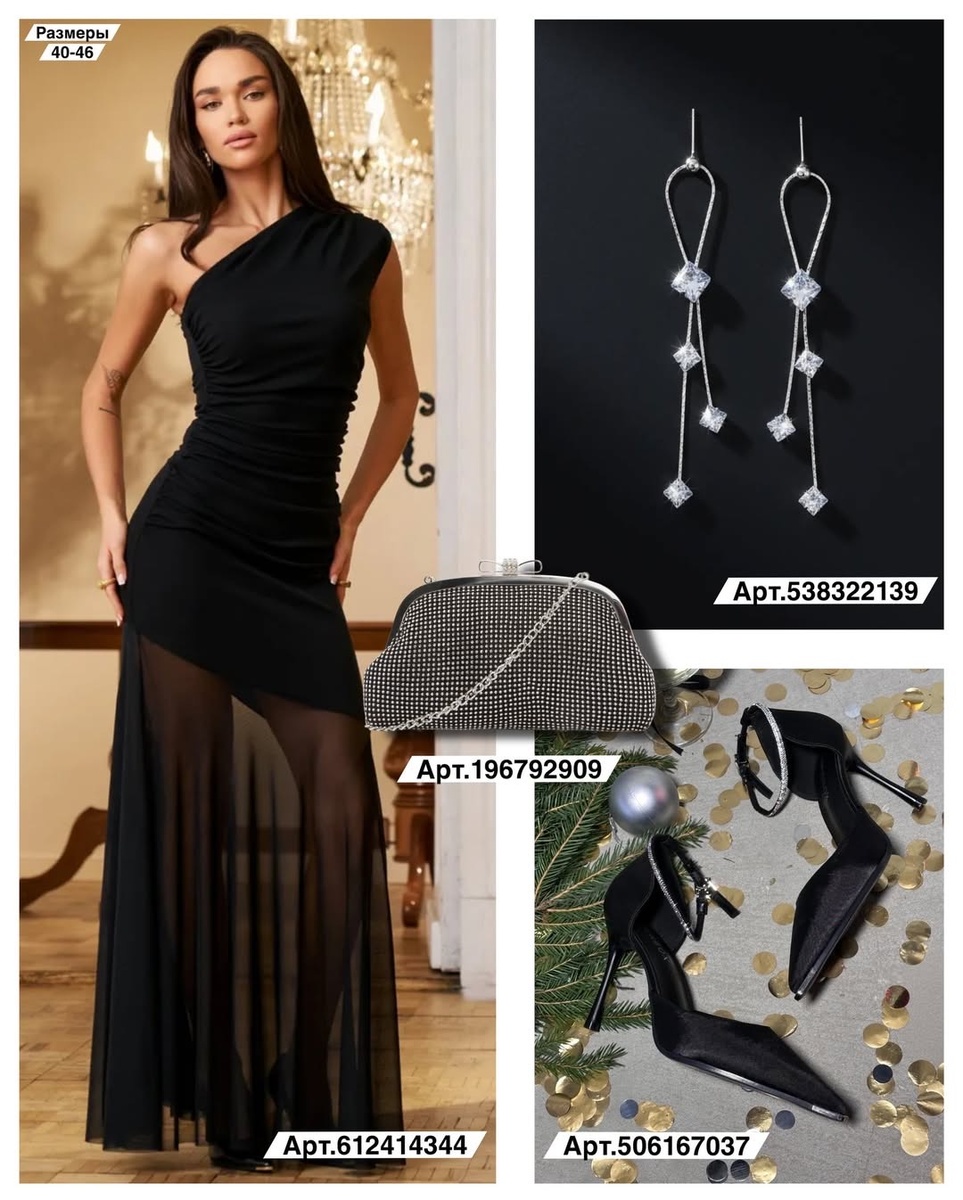 Эта подборка — настоящий гид по идеальному праздничному образу. На фото — два вечерних решения: глубокий чёрный и сияющий белый. Каждая вещь подобрана так, чтобы создавать завершённый образ, в котором каждая деталь усиливает другую.