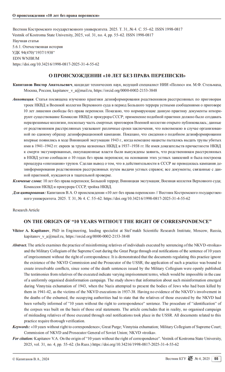 Хорошие новости, дорогие друзья и товарищи, а также дорогие недруги и нетоварищи! Вышла моя статья в журнале "Вестник Костромского Государственного Университета". Это очень достойный журнал из первого квартиля. Конечно, статью называть "моей" совершенно неправильно - над материалом весь "Пролетарский горн" работал несколько месяцев, в одиночку я бы ничего не сделал - чего стоила одна база данных опознанных в Виннице! Сердечная благодарность всем, кто мне помогал - включая товарища рецензента из Костромского университета, чьё имя согласно правилам двойного слепого рецензирования мне неизвестно. Если вдруг кому-то интересно - замечания при приеме статьи были только по оформлению и объему. А основная мысль статьи - 10 лет расстрела без права переписки выдумали немцы - у профессиональных историков возражений не вызвала. Видимо надо понимать разницу между настоящими учеными-историками, специалистами своего дела, способными взвешенно оценивать приводимые доказательства - и невменяемыми ино