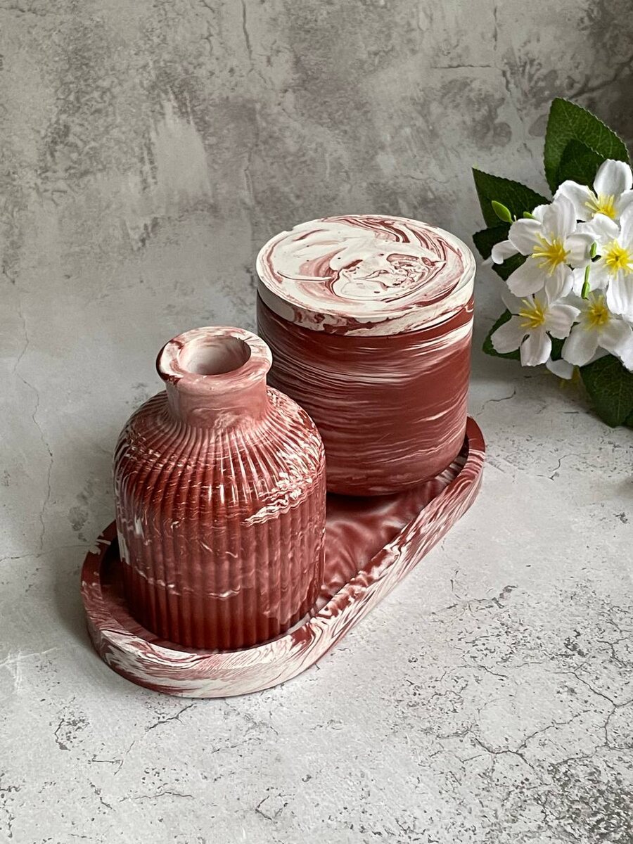 Знаете, что самое классное в мраморной технике? То, что ты никогда не знаешь, какой именно рисунок получится. Ты заливаешь форму, потом ходишь вокруг неё, как вокруг ёлки, где лежат упакованные подарки, и ждёшь, когда уже можно будет их открыть 🎄🎁 Это по-настоящему волнительный и волшебный момент, когда ты вынимаешь готовое изделие из формы и видишь, что получилось. Как "Киндер-сюрприз", правда! В этом наборе мне больше всего понравился узор на подносе. Такой интересный получился! Вазочка и шкатулка (она жа подсвечник) тоже симпатичные. Набор в наличии: 1600 руб. Если захочется превратить шкатулку в свечку, то аромат можно выбрать в этом альбоме. Пишите👇 Телеграм | ВКонтакте