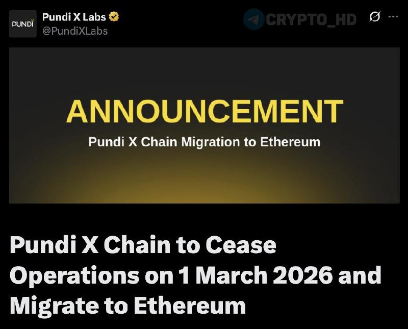 ❌ #PUNDIX Pundi X Chain прекращает работу 1 марта 2026. Команда Pundi X объявила о полной остановке собственной сети и миграции экосистемы на Ethereum. Пользователям требуется вывести и перенести активы вручную. После 1 марта транзакции в сети перестанут обрабатываться, делегирование будет отключено, а оставшиеся токены станет невозможно восстановить. Crypto Headlines