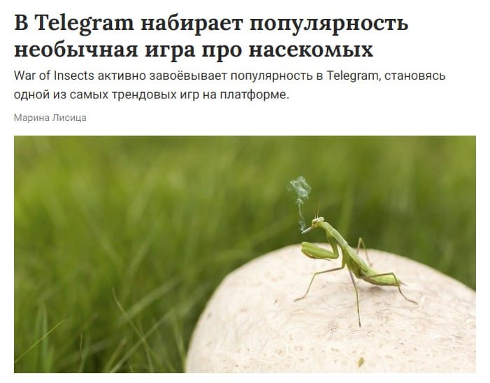 В Telegram набирает популярность необычная игра про насекомых. Это буквально огромная MMORPG в Telegram: открытый мир, масса существ, система навыков, частей тела, строительство и тысячи предметов. Вы муравей, пчела или даже паук, а ваш враг всё, что движется: от навозных жуков до сколопендр и других игроков. Главное играть можно прямо в Telegram. Добавляйте бота в групповой чат, собирайтесь с друзьями в отряд, стройте базу и выживайте вместе. В игре постоянно выходит что-то новое: разрывайте других игроков на части, грабьте, торгуйте и постарайтесь выжить. Поигравшие уже назвали War of Insects «телеграм-игрой года», и если вы ещё не пробовали самое время ворваться. ️Заценить можно здесь: @WarOfInsects_bot Источник Telegram: toporlive