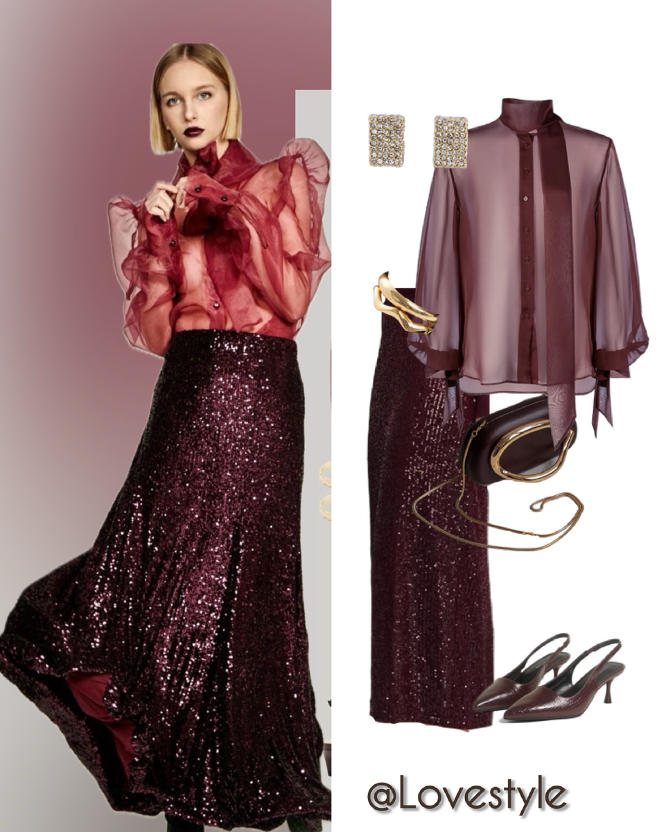 Марафон Новогодних образов объявляю открытым! И так, настала пора активных поисков нарядов на корпоративы и праздничные новогодние вечера. Предлагаю Вам несколько образов для вдохновения. Возможно, у Вас уже есть что-то подобное в гардеробе и Вы не знаете как это надеть по-новому (ну например, юбка в пайетках))) Образ в бордо. Этот цвет не отпускает умы и сердца модниц и будет выглядеть не менее эффектно, нежели красный. Бордовая новогодняя юбка и после может Вам служить, если ее надеть с коричневым или таким же бордовым свитером/свитшотом. А про блузку и говорить не приходится - такое всегда надо! блузка - 534864926 юбка- 599321395 обувь- 396503739 сумка- 306420777 серьги- 551817033 браслет - 228824377 Образ Полли Рыжовой. Сколько раз попадался мне на глаза этот образ известной российской стилистки и сколько же я видела образов с этой юбкой в Pinterest!!! Данная юбка то появляется, то пропадает на WB. Но помните, что есть еще Ozon, Lamoda и собственно магазин/сайт этого бренда