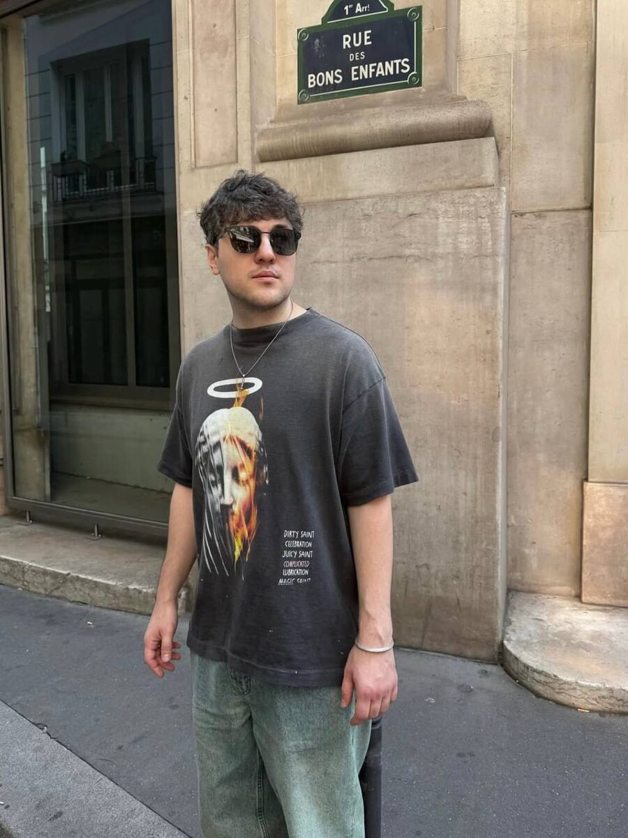 Spotted: комик, сценарист, резидент шоу «Что было дальше?» Эмир Кашоков в футболке и лонгсливе Saint Michael из SV