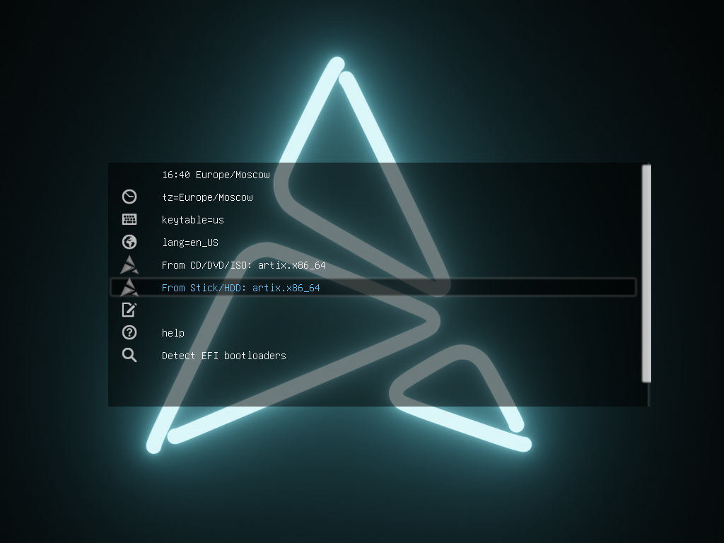 Загружаемся с предварительно скаченного образа, тут небольшой нюанс выбираем либо From CD/DVD/ISO: Artix_x86_64 либо From Stick/HDD: Artix_x86_64. По сути разницы я не увидел(может быть из за виртуальной машины). Выбрал второй вариант.