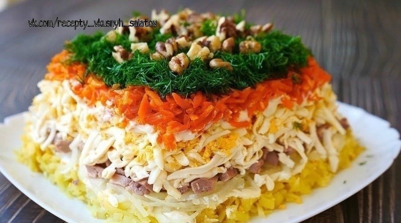 Салаты - рецепты вкусных салатов 🥗 Праздничные, новые, классические, простые рецепты салатов Ингредиенты 1 луковица 30 мл уксуса 9 % 150 мл воды 1 ч. л. сахара 30 г грецких орехов 250 г печени трески 2 вареные картофелины 160 г плавленого сыра 3 вареных яйца 1 яблоко 1 вареная морковь майонез по вкусу 30 г укропа соль по вкусу перец по вкусу Приготовление Лук нарежьте тонкими полукольцами, переложите в небольшую емкость, залейте маринадом и оставьте на 15 минут. Для маринада смешайте воду с уксусом, сахаром и 1 ч. л. соли. Орехи подсушите на сухой сковороде, измельчите. Печень трески извлеките из масла, нарежьте мелкими кубиками, верните в емкость с маслом, перемешайте. На широкой плоской тарелке выложите слой тертого на терке с крупными отверстиями картофеля. Посолите, поперчите по вкусу, смажьте майонезом. Выложите слегка отжатый лук, а сверху — печень трески и тертый плавленый сыр. На сыр нанесите сеточку из майонеза, посыпьте тертыми яйцами. Яичный слой смажьте майонезом