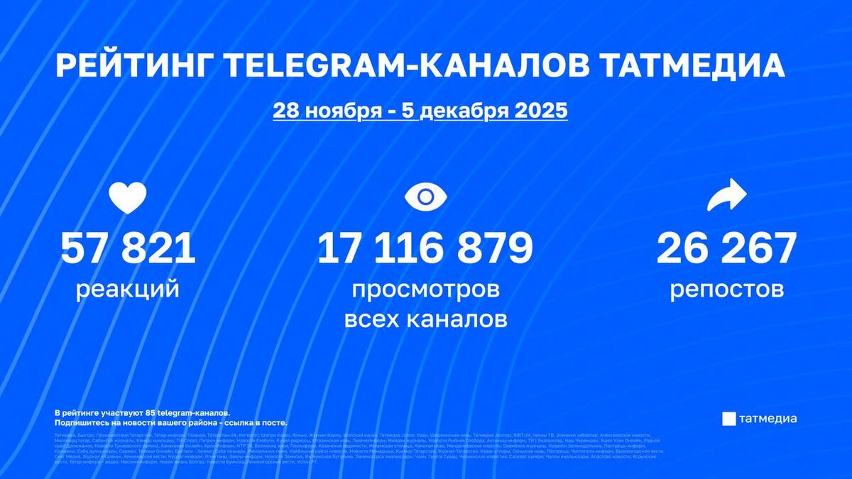 📈📱Новый рейтинг telegram-каналов Татмедиа | 28 ноября - 5 декабря Каналы с наибольшим числом просмотров: 1. ТАТМЕДИА - 2 038 177 2. Новости Зеленодольска - 1 238 419 3. БЫСТРО - 941 374 4. Новости Мамадыша - 774 590 5. Нурлат-информ - 700 400 Посты с наибольшим числом просмотров: 39 737 🔹 ШӘП ПРОДАКШН: «Шәп Продакшн» проекты кысаларында татар телендә контент җитештерүче блогерларның иң яхшыларын ачыклыйбыз! 38 445 🔹 ТАТМЕДИА: «Это безобразие, когда дикие собаки нападают на людей». 26 524 🔹 Татарстан-24: В Татарстане стая собак разорвала 9-летнюю девочку. 11 154 🔹 Происшествия Татарстан: Над Татарстаном сбили второй беспилотник за сутки. 9 742 🔹 Шәһри Казан: Иренмичә генә комментарийларга языгыз инде: ахыр чиктә кайсыгыз көтү көтәргә чыга?) Сезгә дә бу хәбәр килгәндер бит? 9 267 🔹 ТИ-Спорт: Вышел в эфир новый выпуск программы "Спорт без прикрас". 9 239 🔹 ТАТМЕДИА | Живые истории: Сегодня особенный день - День матери. 8 699 🔹 Журнал «Татарстан»: Какую новогоднюю ёлку
