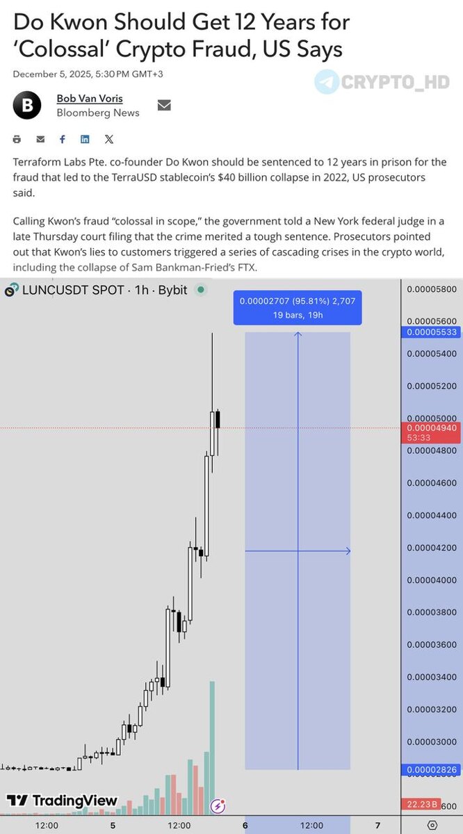 #luna #lunc #ustc ⚖️ Прокуратура США потребовала для сооснователя Terraform Labs До Квона 12 лет тюрьмы за «колоссальное мошенничество», связанное с крахом TerraUSD и LUNA. По версии обвинения, его действия подорвали доверие к крипторынку и стали триггером цепных обвалов в отрасли. Приговор ожидается 11 декабря. P.S. Токен LUNC +95% за сутки! Ранее: признал вину Crypto Headlines