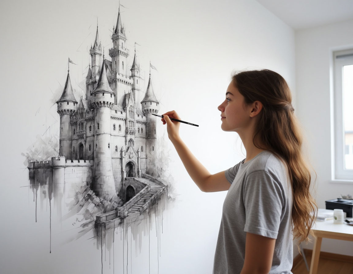 Алина не теряла времени даром. За короткое время её комната превратилась в настоящую мастерскую. Стены украсили фантастические пейзажи с летающими драконами и загадочными замками, потолок превратился в звёздное небо с мерцающими созвездиями, а на двери появился величественный замок с развевающимся флагом. Дочь работала с таким увлечением, что порой забывала про еду и сон – она то добавляла новые детали, то отходила на шаг, оценивая результат, то снова бросалась к стене с кистью в руке.