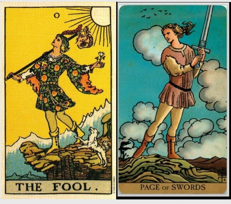 Сочетание Шута (0) и Пажа Мечей — это динамичный, любопытный и немного дерзкий дуэт. Шут — это сама суть начинания, а Паж Мечей — это юный, пытливый посланник, который берёт в руки меч (идею, информацию, слово), чтобы испытать его.