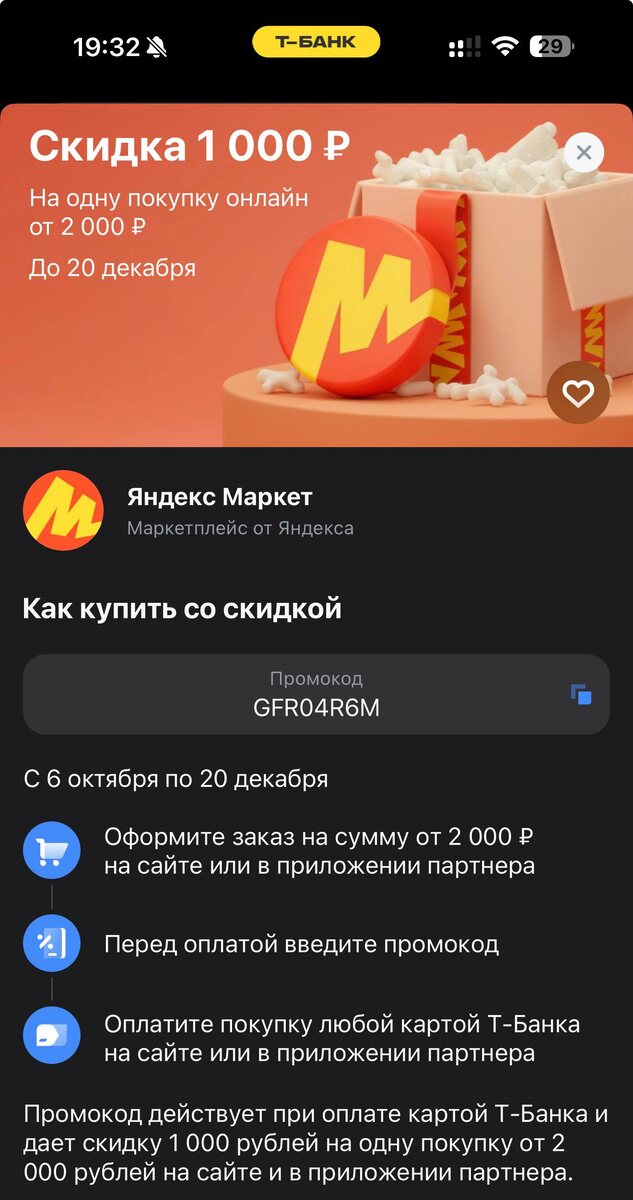 🔥🔥🔥 Делюсь своими промокодами🏷️ На Яндекс маркет вообще 50% Многие, и все промокоды от ЯМ - для нового пользователя, поэтому мне они не подходят. Но если вдруг вы ещё не заказывали ничего на ЯМаркете, то вам эти промики будут полезны. Все эти промокоды, а у кого-то может и другие, находятся в Тбанке. Если вдруг у вас ещё нет дебетовой (НЕ КРЕДИТНОЙ) карты этого банка, то оформляй её по этой ссылки и начинай зарабатывать на кэшбэках. Так ещё и 500₽ получите, при соблюдения правил 😊 Black — дебетовая карта с кэшбэком. Зарабатывайте деньги, а не бонусы. Если оформить по моей ссылке, вы получите 500 ₽ https://tbank.ru/baf/5IAqEtYXyvf П.с. Промокоды ограничены. Либо сохраняете фото к себе в галерею и там копируете пром, либо вводите вручную. Тут кто успел, так сказать)