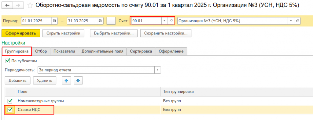 Здравствуйте, мои дорогие бдительные стражи налогового порядка! С вами Оксана Павловна. Вот и снова приближается время сдачи декларации по НДС, а в воздухе, как обычно, витает вопрос: «А всё ли у нас там чисто с ставками? Не затесалась ли где случайно в отгрузке ставка 10%, где должна быть 20%?». Перепроверять каждую накладную вручную — занятие для очень усидчивых, а у нас дел по горло. Давайте сделаем это умно, с помощью самой 1С. Представьте, что вам нужно найти несколько рыжих котов в большом тёмном сарае. Включаем фонарик — в нашем случае это отчёты. Способ первый: Осветим сарай целиком (Оборотно-сальдовая ведомость) Этот способ — как взять мощный прожектор и посмотреть на картину в целом. Идём в «Отчеты» → «Оборотно-сальдовая ведомость по счету». Указываем наш «счёт-лазутчик» — 90.01 «Выручка» и нужный период. А теперь — волшебный пендель! Жмём «Показать настройки», переходим на вкладку «Группировка» и ставим там галочку в пункте «Ставки НДС» И что мы видим? Наша выручка волшебн