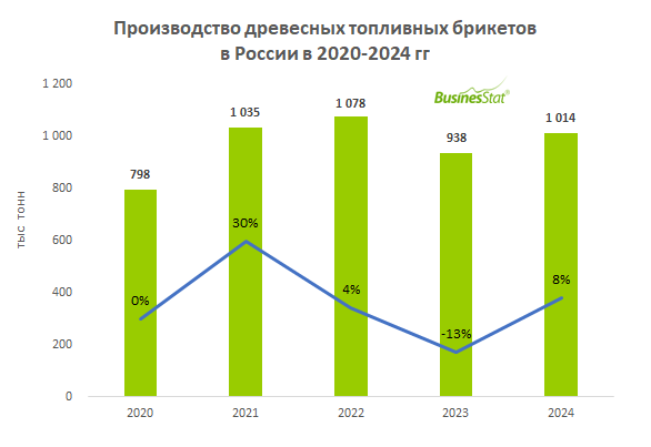 В 2020-2024 гг производство древесных топливных брикетов в России выросло на 27%: с 798 до 1 014 тыс т.