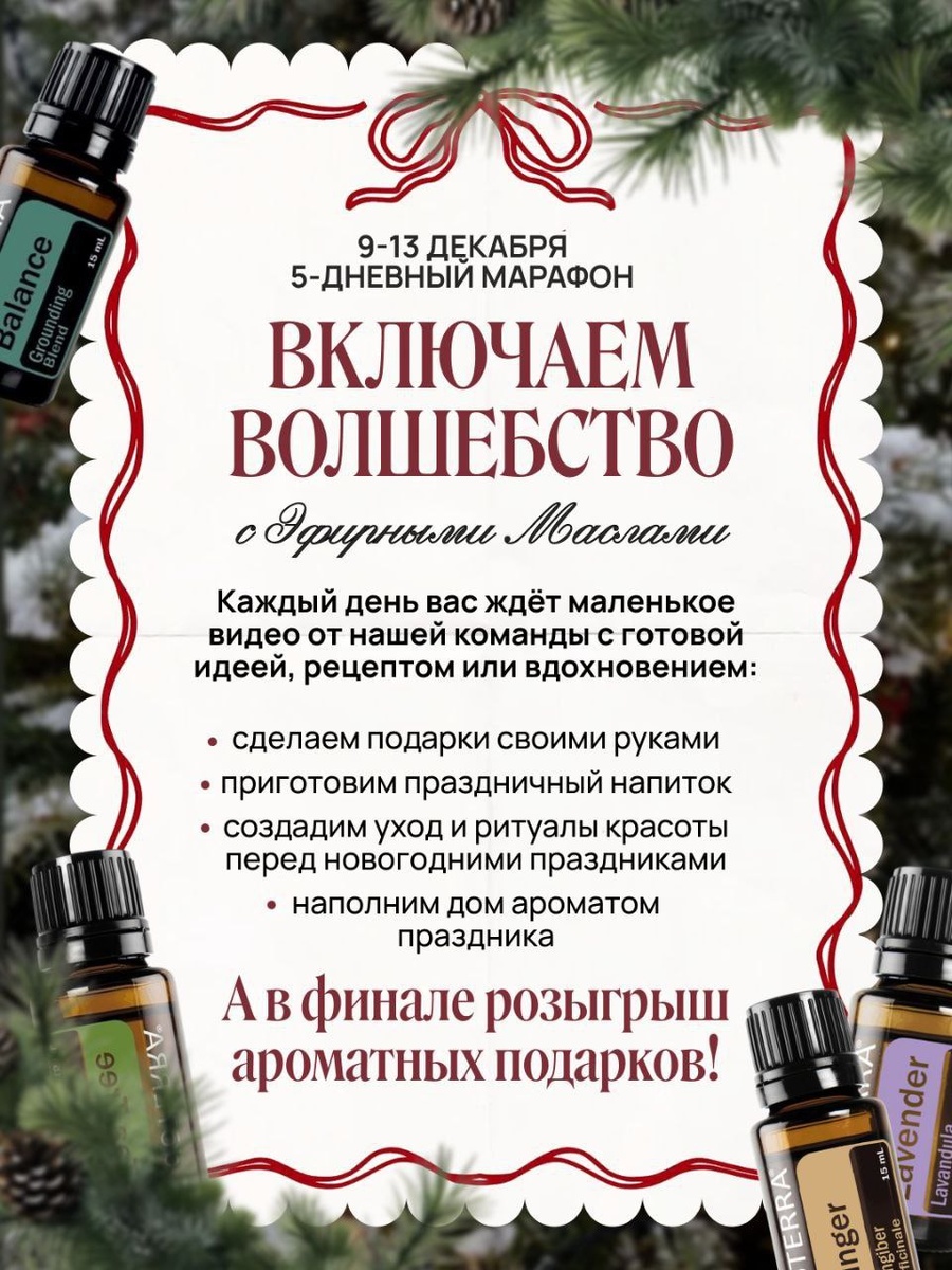 Декабрь уже творит волшебство ✨ Приглашаю на 5-дневный марафон «Включаем волшебство », который мы подготовили с командой и где мы вместе: 🎄 наполним дом праздничными ароматами 🎁 создадим подарки своими руками 🍊 подберём масла для близких 🍷 приготовим уютный праздничный напиток ✨ сделаем простые ритуалы красоты Каждый день — короткое вдохновляющее видео и идея для праздника. В финале — ароматные подарки и видео о цепочке добра 💜 Напишите в комментариях «ВОЛШЕБСТВО», и я добавлю вас в марафон. Начинаем уже во вторник 9 декабря 🌟