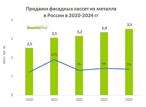 В 2020-2024 гг продажи фасадных кассет из металла в России выросли на 40% и достигли 3,5 млн м².