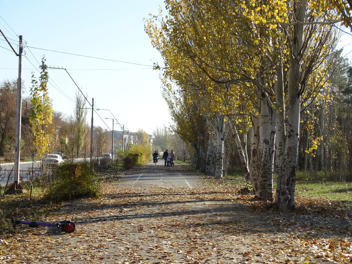 Волжский - очень зелёный город. И если в новой части вполне можно встретить улицы, где деревьев очень мало и они небольшие (новые микрорайоны), то старая часть города буквально утопает в зелени, тут кругом парки и скверы, да и вообще, деревьев на улицах хватает. Причём я не замечал на них следов той варварской обрезки, которая весьма популярна в Волгограде. Это когда крону дереву обрезают до состояния пенька. Вернёмся к скверам. Не все они имеют названия, некоторые на карте города не обозначены никак. К таким скверам относится сквер на улице Комсомольской в границах от улицы Набережной до Московской. Своей набережной в Волжском нет, зато есть одноимённая улица. Здесь прекрасный тротуар, высокие деревья, а за счёт малоэтажной застройки улица имеет некий европейский облик. Переходим через дорогу и вот он - небольшой скверик на Комсомольской, никак не обозначенный на карте. Все фотографии в статье сделаны 9 ноября, но по виду кажется, что значительно раньше. Но ошибки нет, всё верно,
