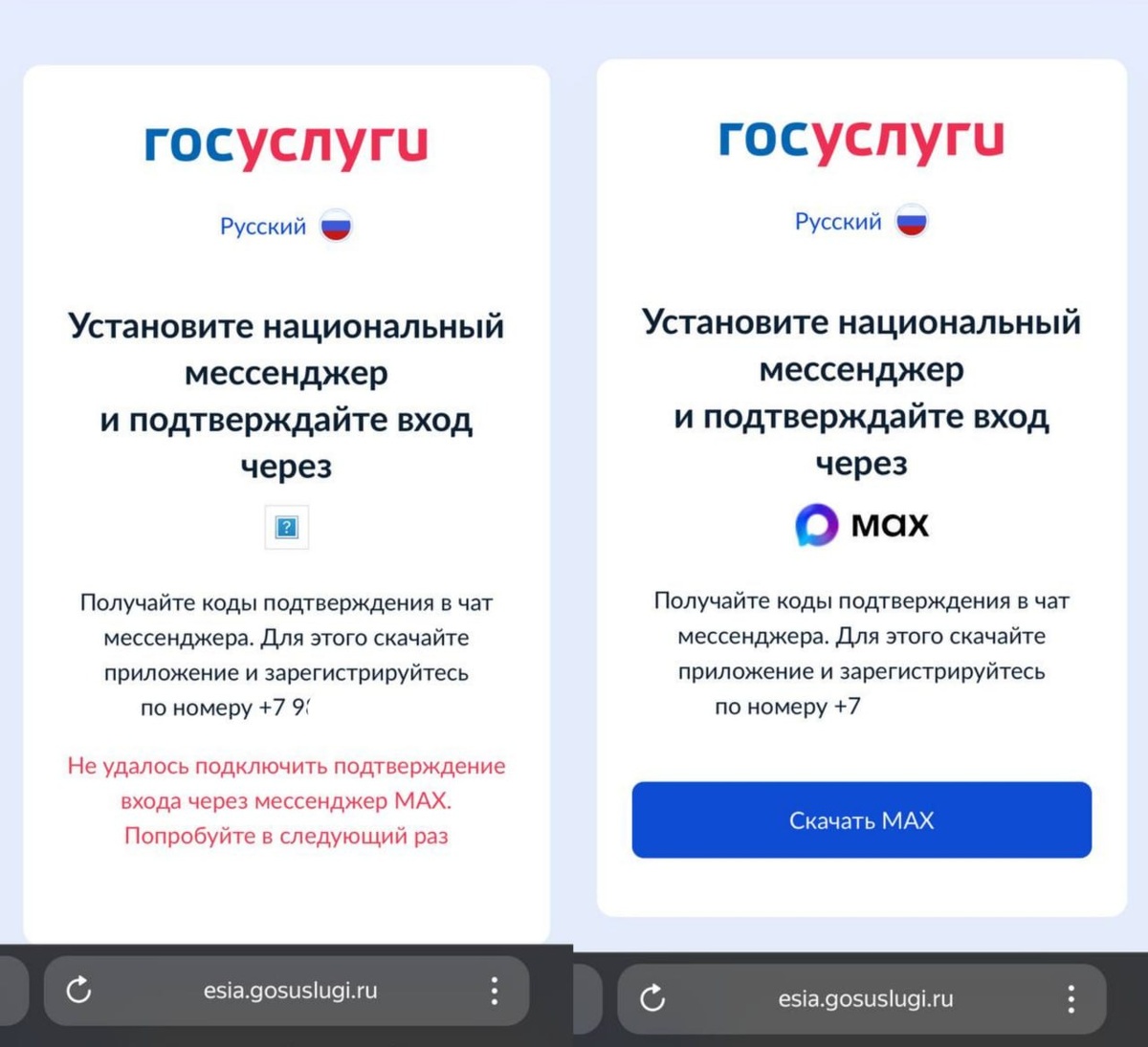Пользователи Android столкнулись с невозможностью войти в мобильную версию Госуслуг без установленного мессенджера Max: даже если у пользователя включена двухфакторная авторизация через смс, портал отключает кнопку «пропустить», запускающую верификацию через Max. При заходе в веб-версию Госуслуг пока есть альтернативы, также сообщается, что авторизацию через мессенджер можно отключить, сменив подтверждение по смс на вход по одноразовому коду. Министерство объяснило изменение правил двухфакторной аутентификации растущим числом случаев мошенничества, когда пользователи «непреднамеренно передают СМС-коды для входа на портал». Из-за этого принято решение об отказе от СМС-кодов в мобильной версии сайта.
