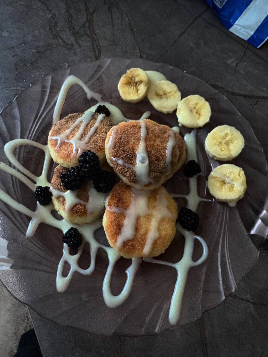 Творог Творожная масса Ванилин Мука Яйца Смешать все ингредиенты, обвалять в муке или манке(для хрустящей корочки ) Обжарить на подсолнечном масле. Украсить ягодами.