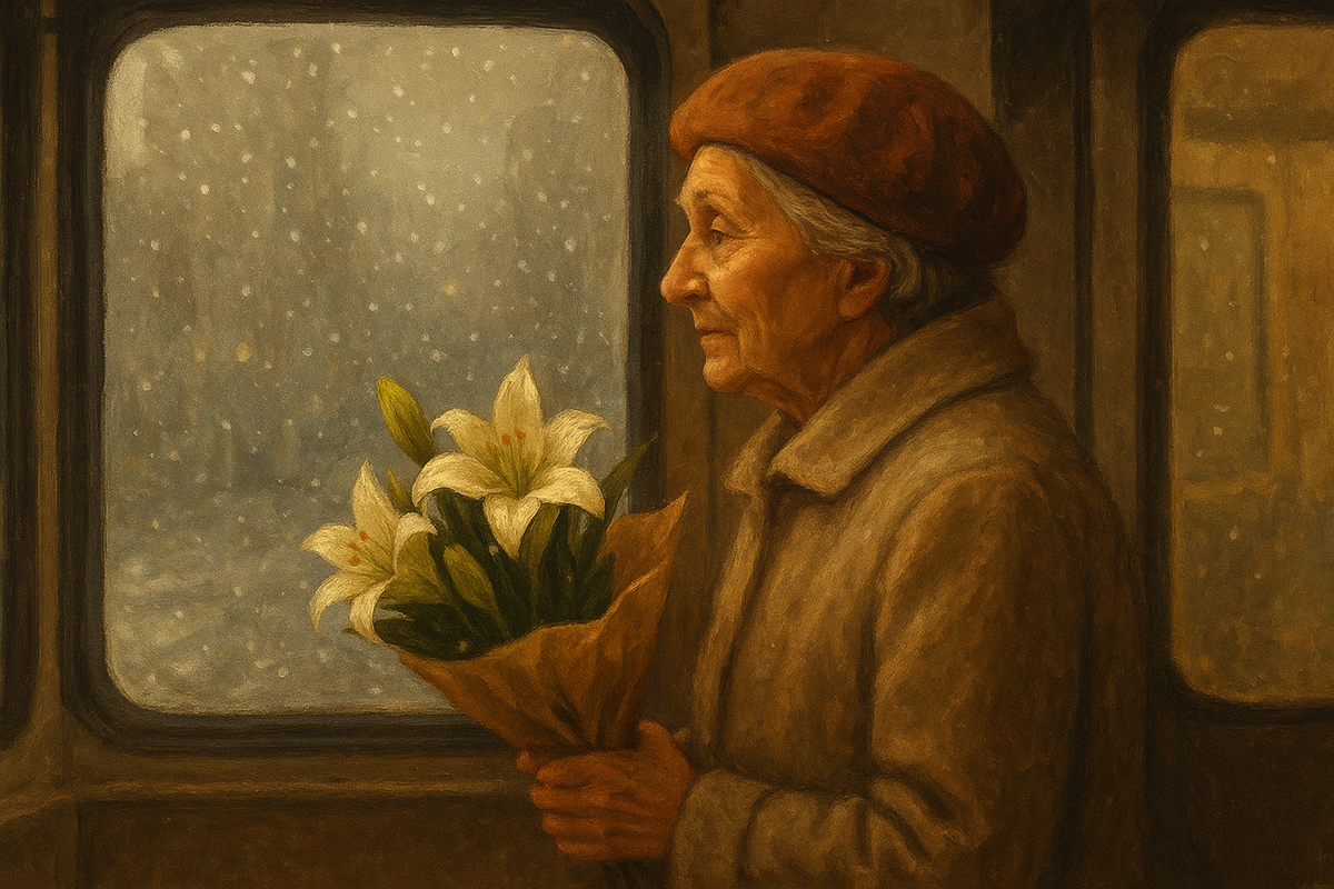Каждое утро я садился в один и тот же трамвай. И почти всегда на втором ряду возле окна сидела она — маленькая, худенькая старушка в светлом пальто и с букетом в руках. Цветы менялись: то жёлтые хризантемы, то алые розы, то скромные гвоздики. Но букет был всегда.