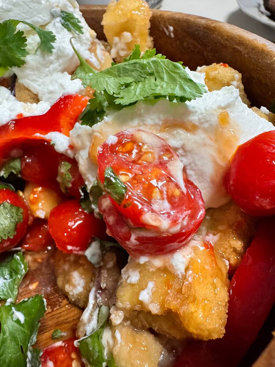 🎇❤️РЕЦЕПТ: САЛАТ С ХРУСТЯЩИМИ БАКЛАЖАНАМИ ✅ИНГРЕДИЕНТЫ: • Баклажаны — 300 г • Томаты черри — 200-250 г • Базилик — 1 пучок • Вода — 50 мл • Крахмал — для обсыпки • Масло подсолнечное — для жарки • Сладкий соус Чили — 140 мл или по вкусу (можно кисло-сладкий) • Творожный сыр — 3 ст.л. ✅ПРОЦЕСС: Баклажаны режем кубиками и обваливаем в крахмале. Чтобы он лучше прилипал, предварительно смачиваем их в небольшом количестве воды. Обжариваем в растительном масле так, чтобы оно полностью накрывало баклажаны (как во фритюре). Режем томаты черри пополам. Измельчаем базилик. Добавляем остуженные баклажаны. Заправляем сладким соусом Чили и перемешиваем. Сверху можно добавить творожный сыр, по желанию (но с ним мне очень понравилось) и украсить кинзой, петрушкой или базиликом. Подавать салат лучше сразу, чтобы баклажаны сохранили хруст! ❓А у вас есть проверенные рецепты с баклажанами? Салаты для меня — редкость. 🍾Садовый бар 📚Книги и Посевной’25 🍅Магазин семян Агрокульт ❤️Знакомство 🌐Нави