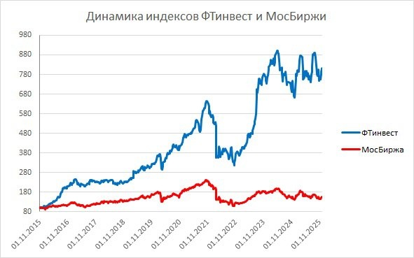❕ За прошедшую торговую неделю наш российский 🇷🇺 портфель – индекс ФТинвест вырос на 2,21% до уровня 813,282, за этот же период времени индекс МосБиржи поднялся на 1,3% до 2711,3 пунктов, таким образом альфа нашего портфеля с 1 ноября 2015 составляет 658,72%, а с 1 января 2025 (+3,94% (индекс ФТинвест) – -5,8% (индекс МосБиржи)) = 9,74%.