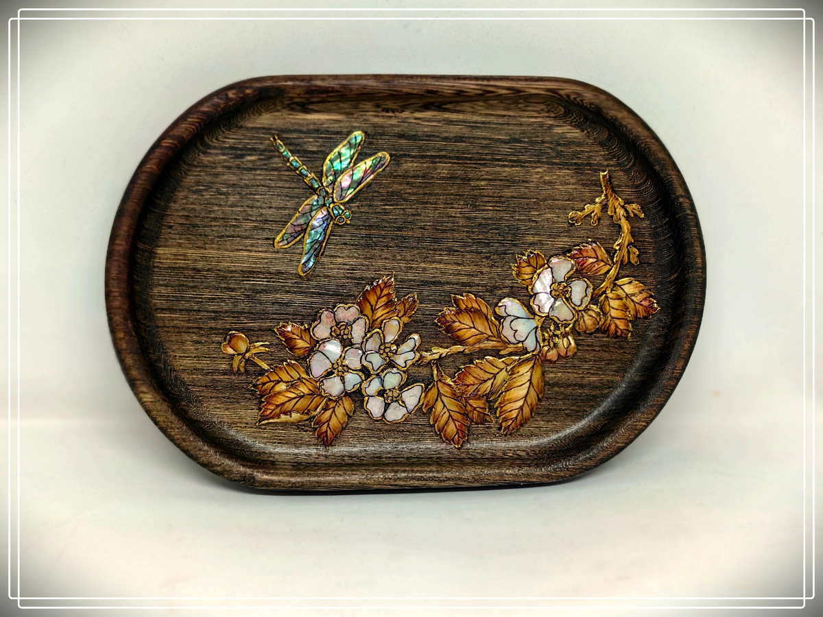 Некоторое время назад я задумала новую серию работ с мозаикой из соломки и перламутра. Эти два природных материала прекрасно дополняют друг друга, и изделия с ними получаются яркими и даже по-своему праздничными. Правда перламутр я использую необычный - очень тонкий. И в работе он требует к себе особого подхода. Первые два подноса-тарелки из новой серии "Ботанические иллюстрации" были выкуплены сразу, и я даже успела повторить их на заказ Третий поднос - тоже выточенный в ручную из ясеня - был немного другой формы и большего размера Я очень люблю старинные ботанические иллюстрации, на которых часто какое-либо растение изображалось рядом с животным или насекомыми. Эту идею я повторила на своих миниатюрных подносах из дерева. Когда я только-только начинала работать с соломкой, то наклеивала детали из нее сразу на дерево. Позже я усовершенствовала эту технику, и добавила бумажную основу с полностью прорисованным изображением. Работать сразу стало намного легче. Основа позволяет "поигра