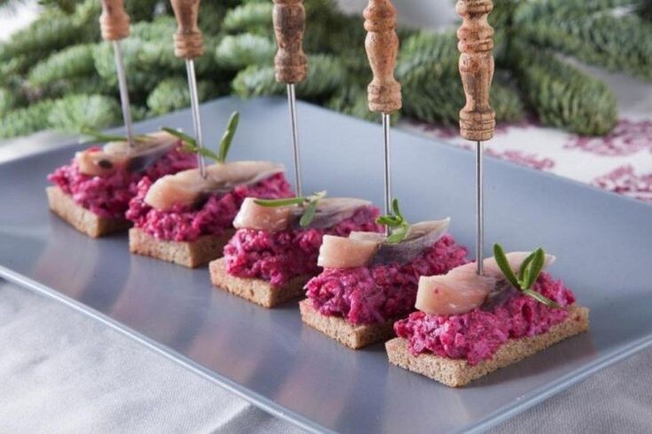 На каждый ломтик хлеба выложить сначала свекольную массу, затем кусочки сельди, а сверху – яичную смесь. Украсить веточкой зелени.