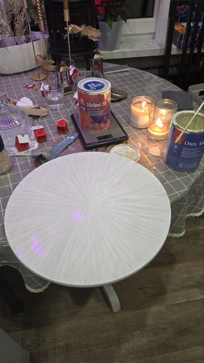 NB! Никогда не оставляйте СДВГшника скучать дома! Помните мой вращающийся деревянный столик? Быть ему в цвете сезона 2026 по версии Pantone - облачный танцор. Давно (2 дня) вынашивала идею. Наждачка, грунтовка и краска имеются. Кисточку стырила у школьников. Муж уехал на хоккей, дети по норам, я пила чай при свечах и... Загрунтовала, завтра покрою первым слоем краски. По идее двух слоёв должно хватить. Да там и краски на большее количество слоёв не хватит 🙈 Думаю вот... А лаком надо потом покрывать? Кто знает?