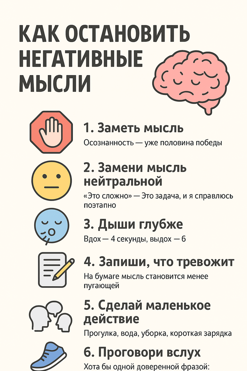 Негативные мысли могут накрыть внезапно: по пути на работу, перед сном или после неприятного сообщения. Главное — понимать, что управлять ими возможно. 🛑 1. Заметь мысль Первый шаг — просто остановиться и понять, что ты сейчас думаешь. 📌 Осознанность — уже половина победы. 🔄 2. Замени мысль нейтральной Не обязательно сразу думать позитивно — достаточно убрать драматизм. 📌 «Это сложно» → «Это задача, и я справлюсь поэтапно.» 🧘♂️ 3. Дыши глубже Несколько медленных вдохов снижают стресс и «перезагружают» реакцию мозга. 📌 Вдох — 4 секунды, выдох — 6. ✍️ 4. Запиши, что тревожит На бумаге мысль становится менее пугающей. 📌 Часто видно, что проблема не так велика. 🚶 5. Сделай маленькое действие Активность отключает бесконечное «прокручивание». 📌 Прогулка, вода, уборка, короткая зарядка. 👥 6. Проговори вслух Разговор помогает увидеть ситуацию со стороны. 📌 Хотя бы одной доверенной фразой: «Меня тревожит…» ⭐ Итог Негативные мысли — это не приговор. Можно остановиться, перевести ды