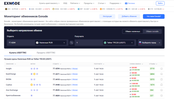 Первым делом необходимо выбрать надежную точку для обмена. Для этого стоит использовать специализированные агрегаторы, такие как Exnode. На подобных площадках можно: